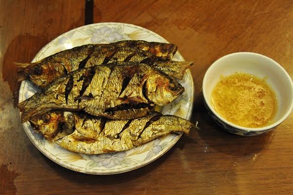 Cá đã nướng thơm được gỡ khỏi que rồi mới mang ra rán, ăn nóng kèm theo đĩa rau thơm và bát nước mắm chanh ớt (cũng có thể chấm tương Bần), thêm chút tỏi, gừng băm nhỏ sẽ càng làm tăng thêm vị thơm ngon của cá